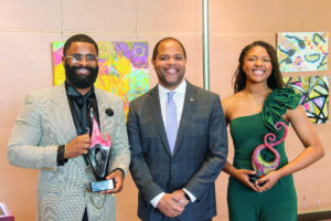 Mayor Johnson (middle) announced Kristoddie Woods (left) and Cadence Diggs (right) as new Poets Laureate.