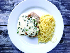 Add wine and broth to pan. Stir, scraping the bottom of the pan to lift up browned bits. Let mixture cook until reduced by half, about 7 minutes. Reduce heat to medium low and whisk in cream. Simmer until reduced by half, about 6 minutes. Stir in lemon juice, parsley and capers. Season to taste with salt and pepper. To serve, place pasta in the center of the plate and top with a pork chop. Drizzle with sauce and sprinkle with parsley.
